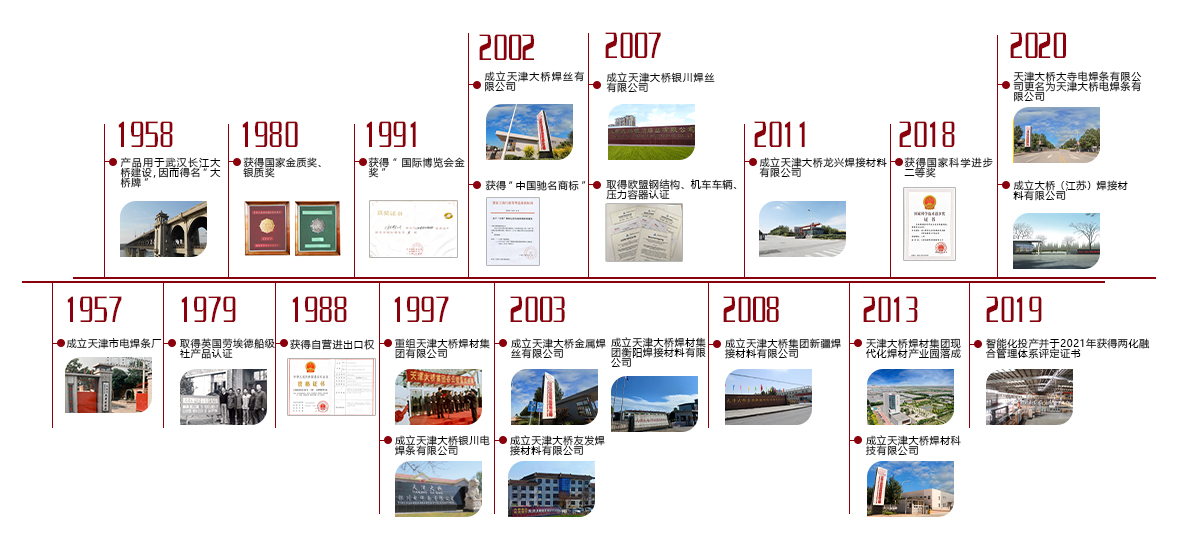 天津市電焊條廠創(chuàng)建于1957年。1958年,共和國(guó)橫跨長(zhǎng)江的第一座大橋——武漢長(zhǎng)江大橋選用天津市電焊條廠焊材,這是國(guó)產(chǎn)焊條首次應(yīng)用在國(guó)家重點(diǎn)工程中,“大橋牌”由此誕生。1997年,天津市鈦鐵實(shí)業(yè)總公司與天津市電焊條廠實(shí)行股份制重組,正式創(chuàng)立天津大橋焊材集團(tuán)有限公司。